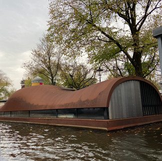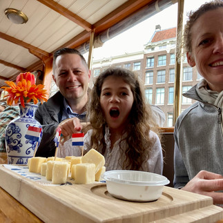 After this sombre time we hopped on a canal cruise and enjoyed a delightful tour through Amsterdam accompanied by wine and local cheeses. We learned some fun facts such as: Canals were originally 3 m deep but now much less in many spots. There are so many bikes in them that they have to use a trawler-like boat to scoop them out continuously. The city’s wealth was built on the spice trade, but spices and water don’t mix so they would store them on the top stories of these buildings lining the canals to protect them. Thus, they had hooks on the eves of each building, and most of them lean out a tiny bit over the water, so that they could pull spices up and down to the canal. To this day, they use these hooks to move furniture etc. in and out of these homes because they have such small doorways and stairwells. The doors and stairs are so narrow because people historically were taxed on the width of their homes and the number of windows. Finally, we learned a bit about the house boats. Apparently when you buy a permit for a houseboat it lives forever, so they get passed down in families. At one time the land-based housing crisis was such that there was no space in some of the canals to actually move a boat, it was wall-to-wall houseboats. Some houseboats are very simple, yet some are very modern, and some are up to 3 stories high and elegant.