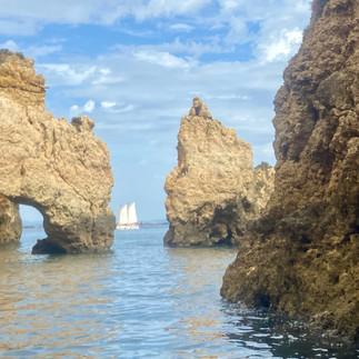 On Monday we headed over to Lagos (west about half an hour along the Mediterranean coast) and took a big sailboat (Bom Dias) out to the grottos. They anchored out there and took us in small groups into the grottos/caves themselves. The crew was very knowledgable, kind, and darn impressive boat captains (navigating those tiny channels with other boats and kayaks etc.). We also jumped off the sailboat to swim (yup, still freezing). The other folks on the trip were incredibly enthusiastic and the overall atmosphere was very festive. We could also see, from the boat, the lighthouse that is the farthest southwestern tip of Portugal.