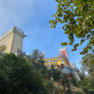 Then we had to hit the road to head back north (we were hugely grateful to Daniel and Sarah for spending one of their precious few days transporting us to Lisbon). We first again went back to Sintra to check out Pena Palace, which Sally had learned about in school last year so it was definitely on the "must see" list. . The fog came back in, again contributing to an enchanted atmosphere. Pena was nuts! Next time we will explore the grounds more, because the gardens seemed endless and magnificent. The actual palace looks like they took several palaces drawn by small children and smushed them together. The architecture is disjointed and colorful. The royal family only moved out quite recently (1909), but the original monastery was built there in around 1500. As we toured along the walkway there were brief moments in which the fog lifted and we had a view down to Lisbon and the Moorish castle ruins above.