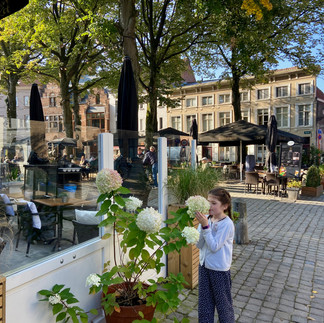 Our very first stop after check-in was WAFFLES, of course, at the delicious Maison Dandoy, recommended by the concierge. Then we wandered about until it seemed reasonable to eat again...:) After lunch, a quick nap at the hotel and then back out for a Belgian chocolate-making course! This was so fun. Finally, to dinner at Brasserie Ommegang, which was charming on a small square. Generally we sat outside, both to enjoy the people-watching (amazing) and to avoid the COVID, but that did put us around plenty of cigarette smoke, so I suppose you have to choose your poison. The city was still impressively beautiful at dusk as we headed back to the hotel.